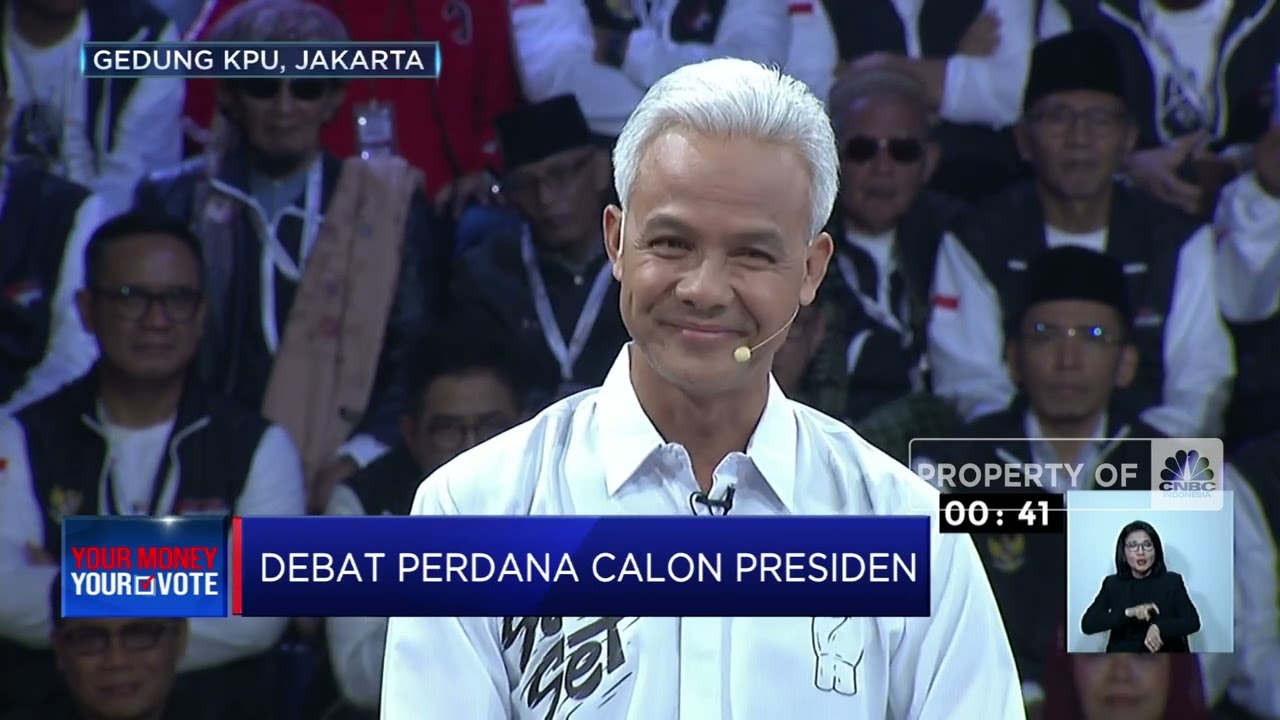 Komisi Pemilihan Umum (KPU) menggelar debat perdana calon Presiden 2024 di Gedung Komisi Pemilihan Umum. Ketiga calon presiden beradu visi misi serta gagasan soal pemerintahan, hukum, HAM, pemberantasan korupsi, penguatan demokrasi, serta peningkatan layanan publik dan kerukunan warga.